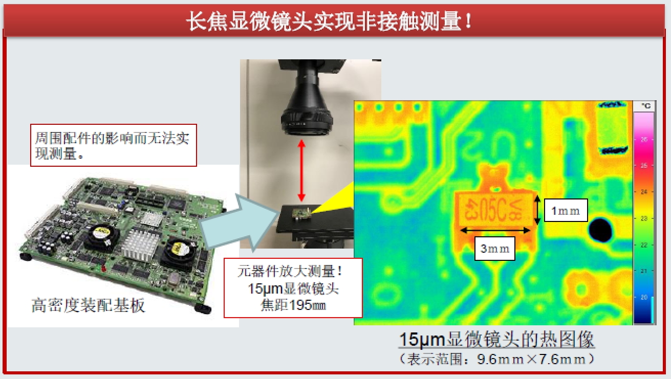 需要評價裝配基板上的小型配件的發熱時,因為過于細小而使用熱電偶無法實現測量。配件裝配過密鏡頭也無法捕捉。
